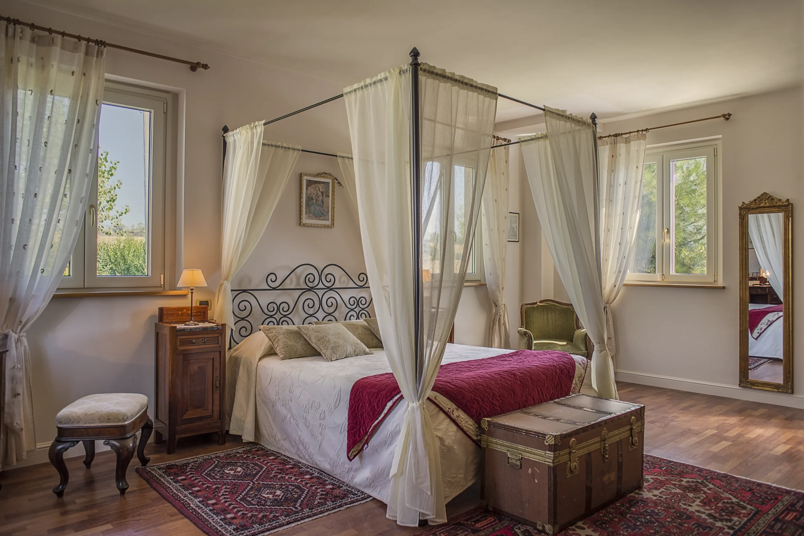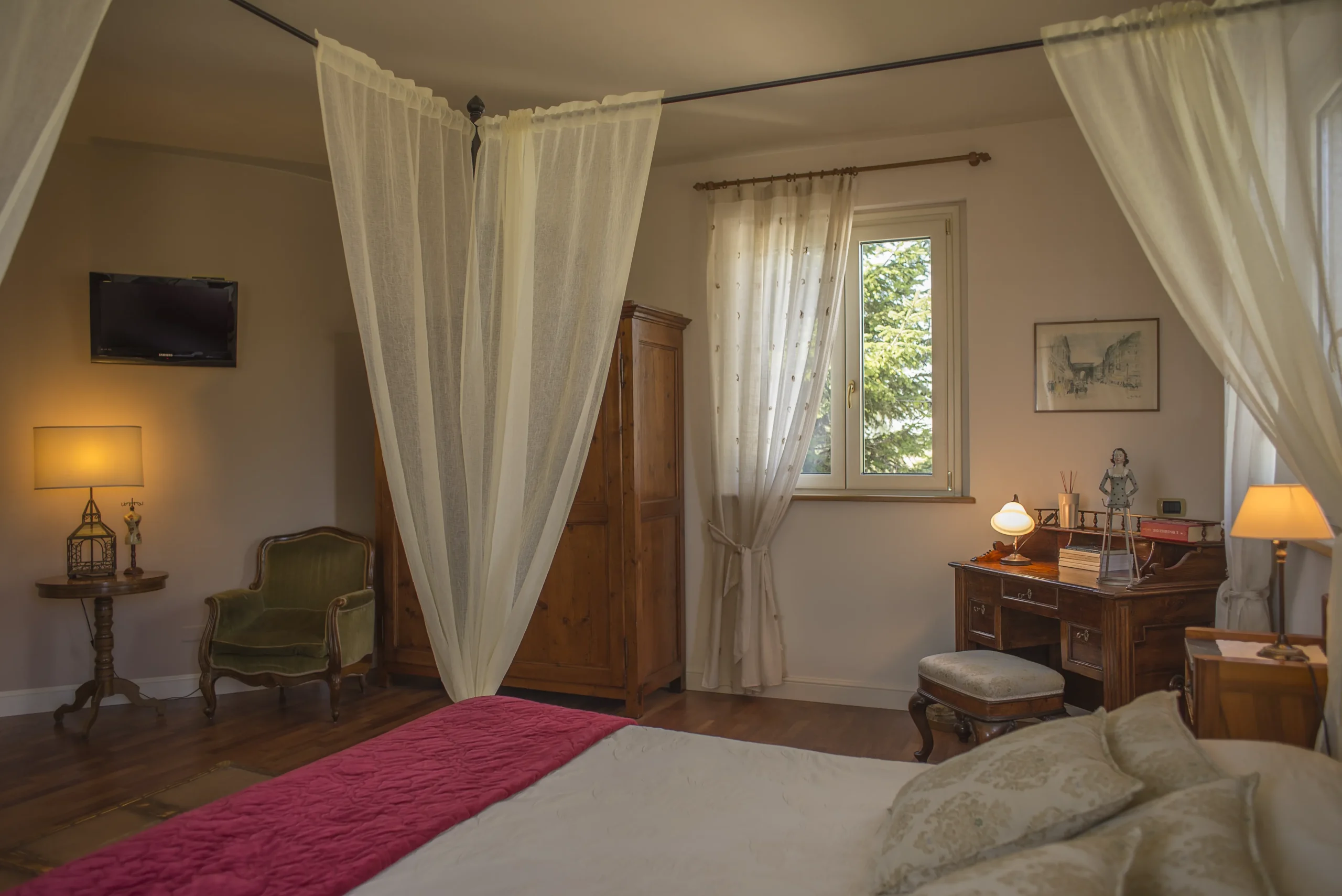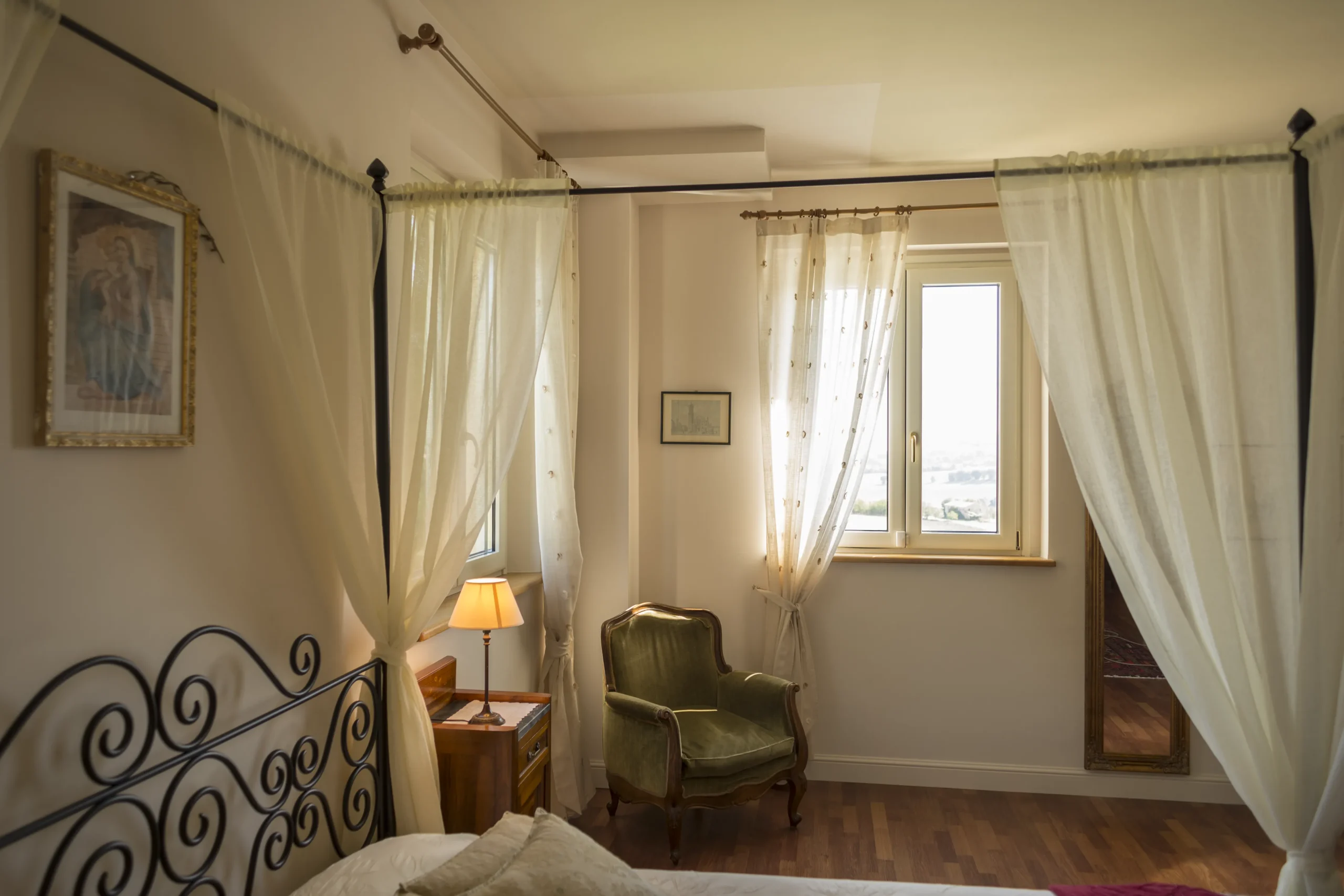 Oggi Senatore Cappelli è una camera matrimoniale con possibilità di terzo letto, di circa 38 mq, situata nella villa principale. Può accogliere fino a tre persone, offrendo uno spazio ampio e luminoso. Tra gli arredi si trova un vecchio scrittoio, un tempo utilizzato come “ufficio” per le pratiche familiari, accanto a mobili d’epoca che mantengono intatto il carattere originario della stanza. Il pavimento in legno e il bagno privato con mosaico in pietra locale completano un ambiente che unisce memoria e comfort in modo naturale. Le finestre si aprono su tre lati, con vista sui Monti Sibillini, sulla piscina, sulle colline e, in lontananza, sul Monte Conero.