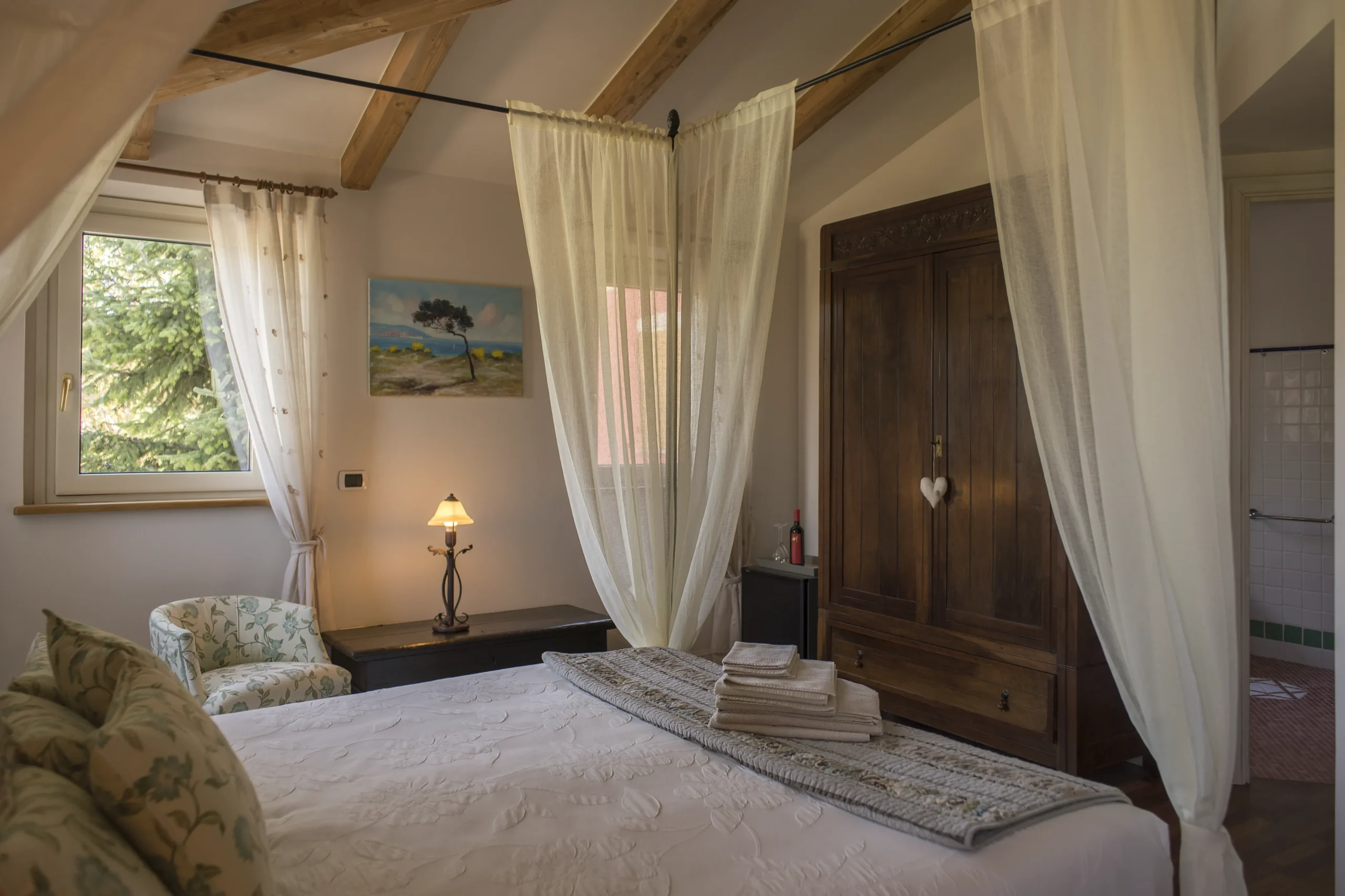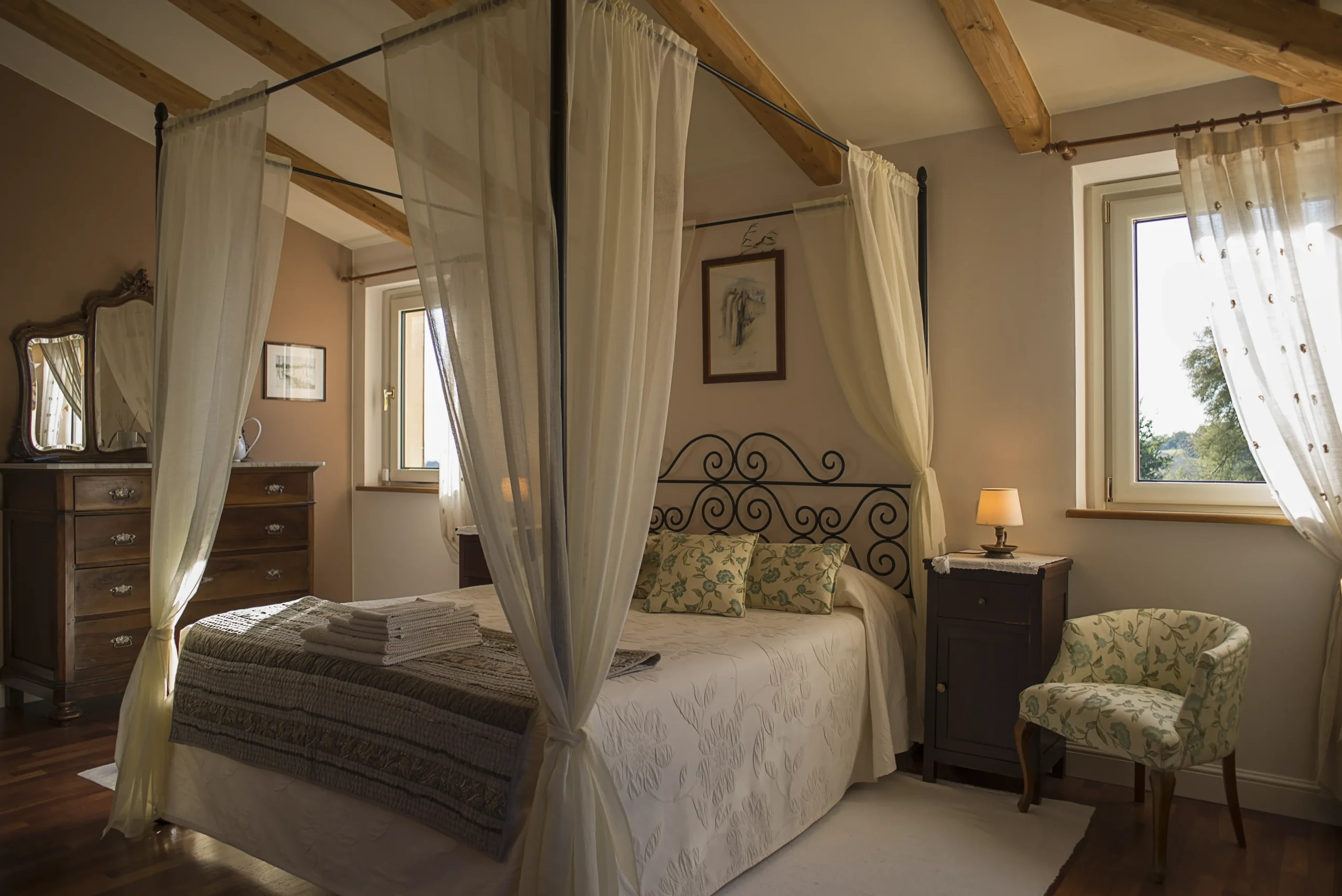 Oggi è una camera matrimoniale di circa 28 mq, situata nella villa principale. Accoglie due persone in uno spazio luminoso, dove il pavimento in legno e gli arredi d’epoca creano un’atmosfera calda e raccolta. Un comò di fine Ottocento, portato in dote dalla sposa, richiama la consuetudine di un tempo. Il letto in ferro battuto realizzato da un artigiano locale mantiene vivo il legame con la tradizione della casa. Essendo collocata ad angolo, affaccia su due lati: da una parte la piscina e, nelle giornate limpide, i Monti Sibillini; dall’altra la campagna marchigiana.